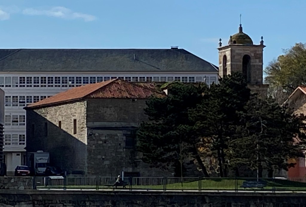 Un poco más adelante está a la derecha la Iglesia de la Orden Tercera, que se divisa por su parte trasera, junto al museo Luis Seoane, y tras de los cuales medio oculto está el antiguo Hospital Militar, hoy hospital Abente y Lago.