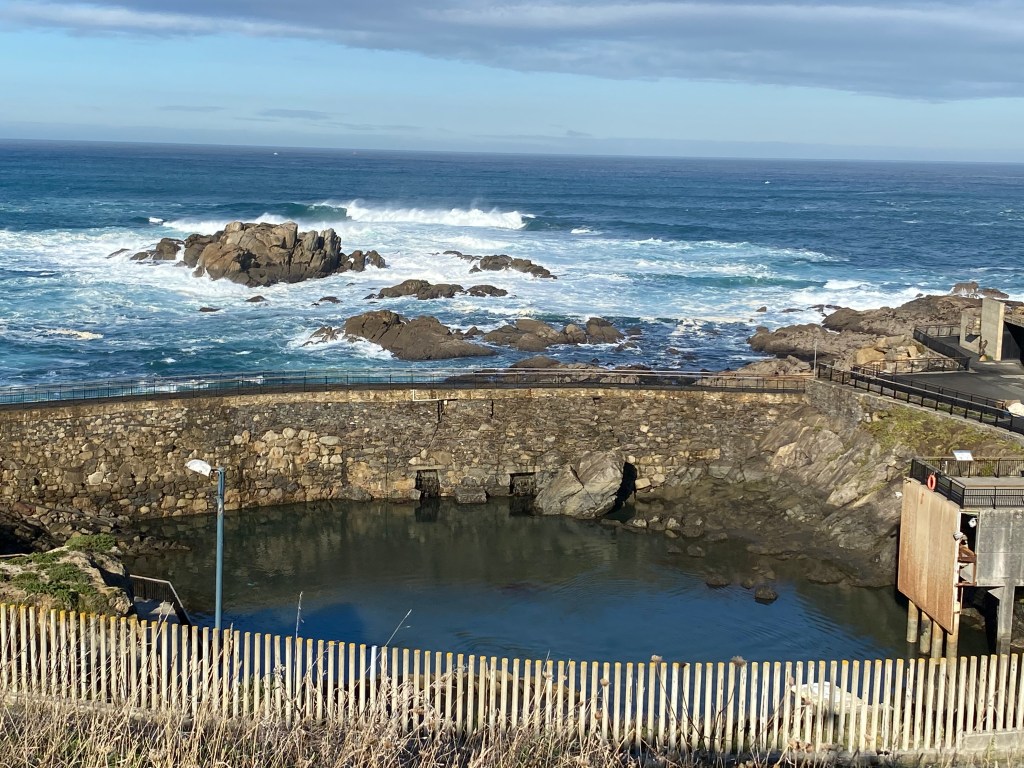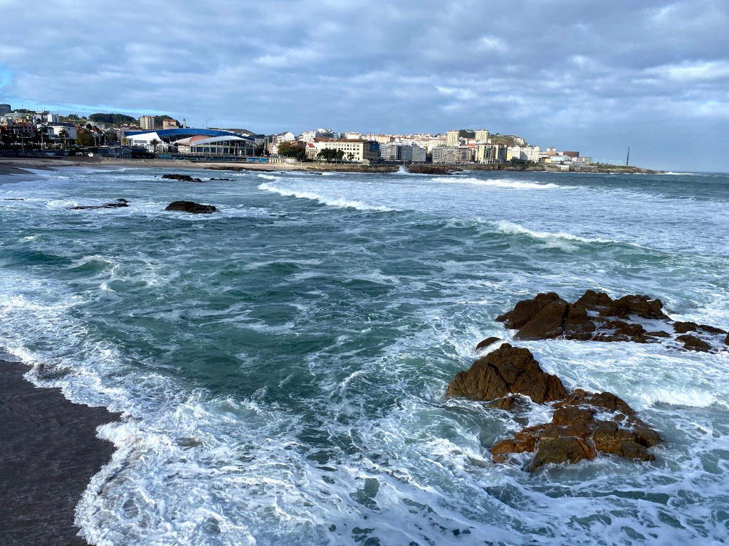 Y si, en un nuevo y diferente paseo, partiendo del mismo lugar (parte trasera del IES Eusebio da Guarda), nos dirigimos a la derecha, en dirección a la Torre, el recorrido (siempre bordeando el mar) después de sobrepasar el monumento a los policias ya descrito y fotografiado, nos lleva en primer lugar a pasar junto a la fuente de los surfistas, frente al hotel Maria Pita, y sobre la playa del matadero donde los aprendices de surfista hacen sus pinitos.