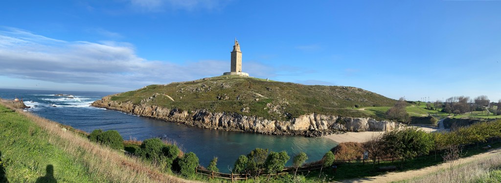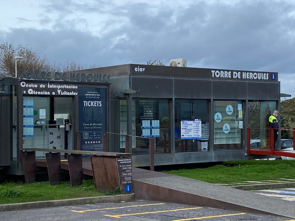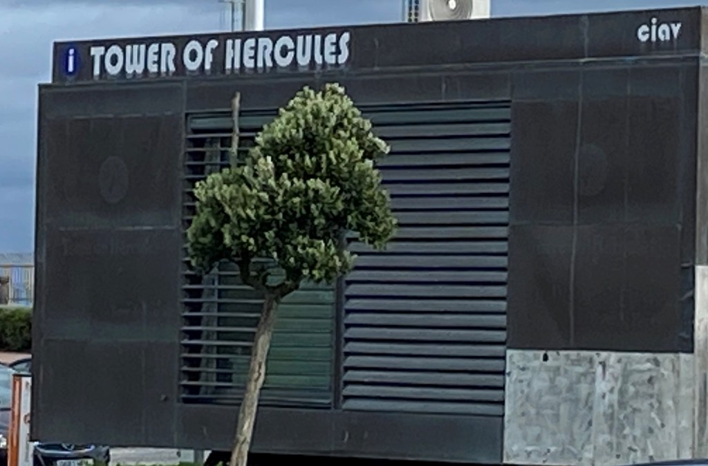 Antes de abandonar esta zona de acceso, viene a colación comentar un aspecto que me llama la atención. Desde hace unos años se ha levantado en esta zona una caseta de información a los visitantes, que sin duda es de agradecer pero que, a fuer de darle originalidad y supongo que con la idea de internacionalizarla, tiene en su parte trasera una inscripción que, sin ser yo un reputado lingüista, me cruje al verlo. Algún entendido, para que desde atrás se viese en inglés lo mismo que indica por delante ha traducido lo de Torre de Hercules, por «Tower of Hercules», imagino que a través del traductor de google o similar. A mi limitado entender procedería poner «Hercules’ tower»