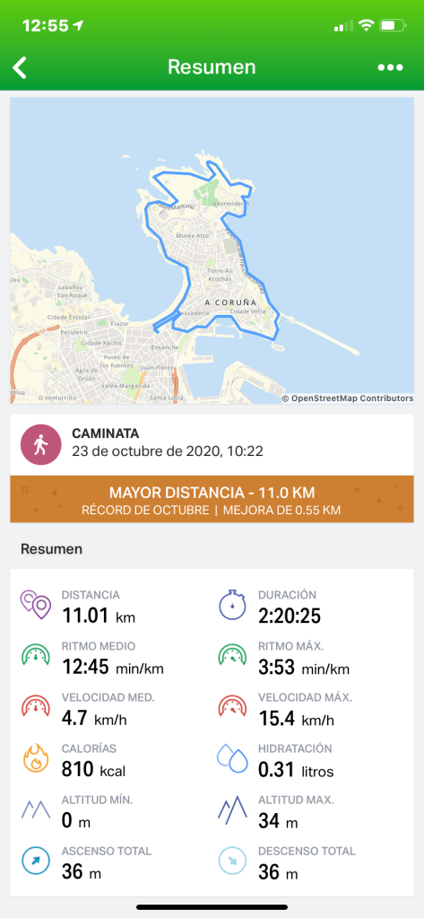 Después de más de una semana sin salir a caminar, hoy me organicé para hacer de nuevo mi recorrido preferido junto al paseo marítimo: dirección este saliendo desde casa, es decir, bordeando el mar hacia la Torre de Hércules, y transitando por tierra desde el Acuario (Casa de los Peces), contorneando la Torre y toda la costa hacia la Caracola y luego continuando hacia San Amaro junto a los Menhires, Cementerio Arabe y posteriormente retomar el paseo marítimo hasta la dársena, jardines y regreso a casa por Juana de Vega. Total 10,12 kms. según Endomondo, con una media superior a los 6 kms/hora, es decir algo menos de 1o minutos cada km.