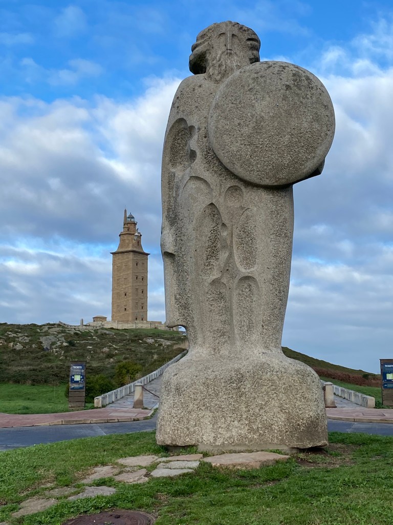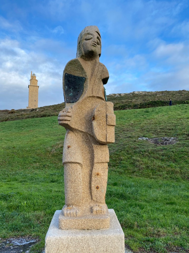 Al llegar a la rotonda desde la que se iniciaría la subida al monumento, nos encontramos una gran estatua de Breogán, obra de Xosé Cid. En ella aparece el heroe mitológico gallego con su espada y escudo.