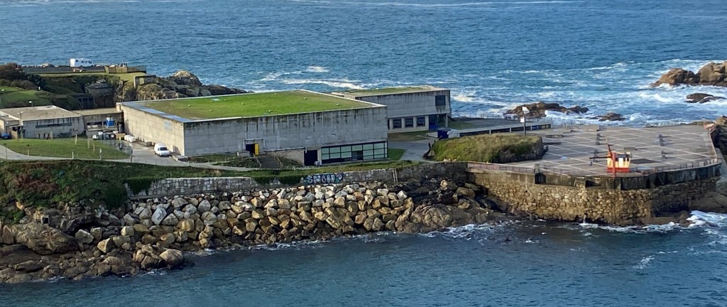Poco más adelante nos encontramos, a la izquierda, con un laberinto de pequeños lagos semioculto entre la vegetación, y a la derecha con el edificio de la antigua Prisión Provincial, hoy muy deteriorado y que evito de forma consciente poner aqui. Simultáneamente tiene el paseante, mirando a la izquierda, una impresionante vista de la Torre de Hércules, con la playa de As Lapas debajo.