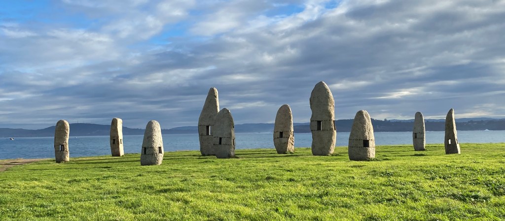 Continuando el recorrido hacia San Amaro, encontramos la escultura denominada Hercules na nave dos Argonautas, hecha en granito, para llegar un poco más adelante a la zona donde están ubicados los Menhires por la Paz, un conjunto de doce esculturas que representan a la familia, por lo cual hay dos de mayor tamaño que hacen referencia a los padres y destacan sobre las otras diez. Todas ellas tienen un hueco en el centro desde los cuales se puede observar en un sentido la Torre y en otro sentido el mar. Los menhires están situados en dos círculos concéntricos.