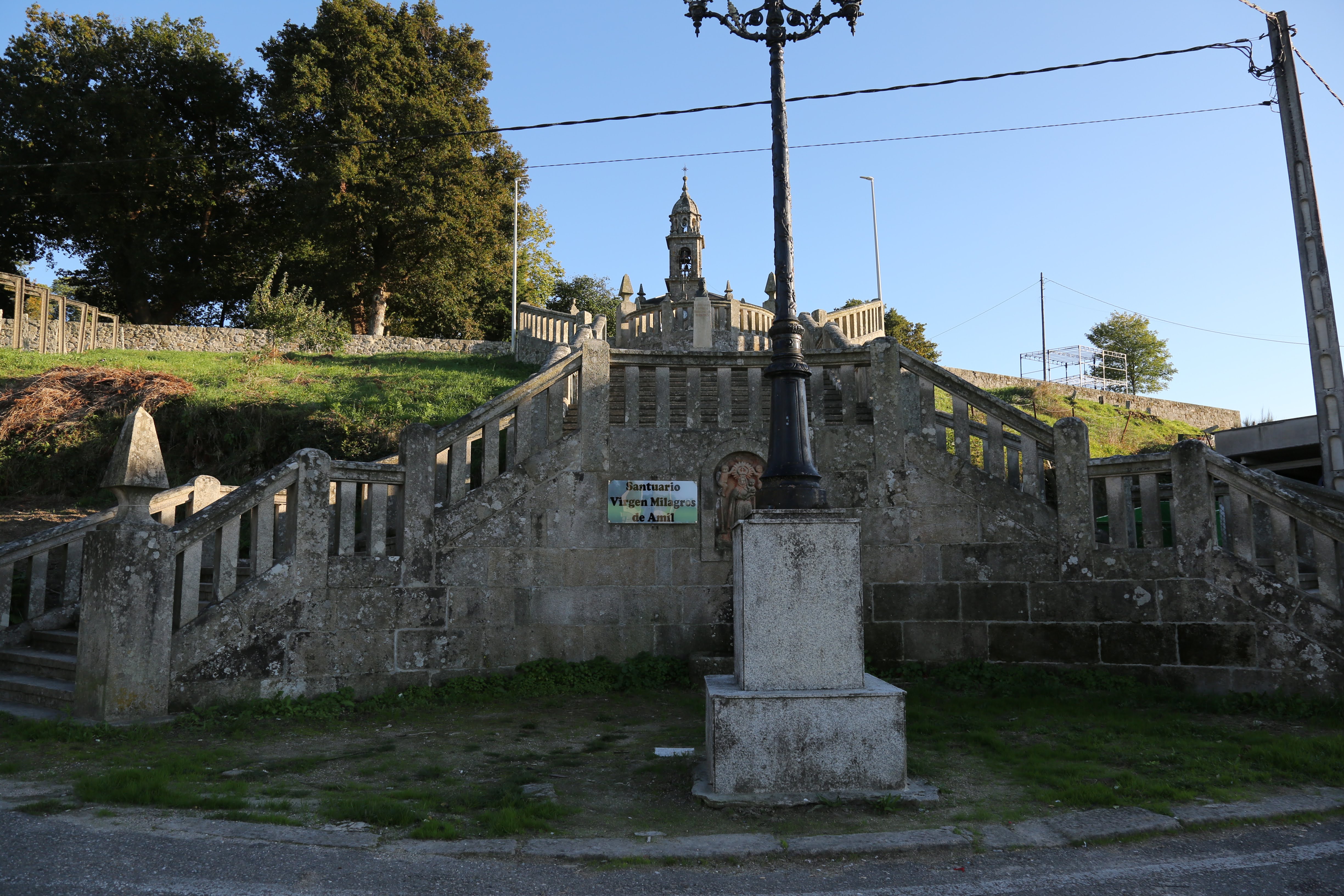 Terminada la comida, nuevamente a los coches para ir hasta las cascadas el Barosa. Los muiños la verdad están muy deteriorados y poco tienen que ver, pero en cambio a todos gustaron las cascadas y el paisaje en general, y tuvimos ocasión de hacer numerosas fotos de grupo para el recuerdo. Terminada esa visita, nuevamente a los coches para ir hasta el santuario de Los Milagros de Amil, que a mi personalmente no me causó ninguna impresión especial. Una iglesia de planta octogonal en la que casi lo más llamativo era la escalinata de acceso y la «fauna» asistente a un bautizo que alli se celebraba en esa tarde. Con lo cual, terminado ese recorrido, ya nos dirigimos al Pazo donde nos alojamos, con la idea de aprovechar allí el resto de la tarde.