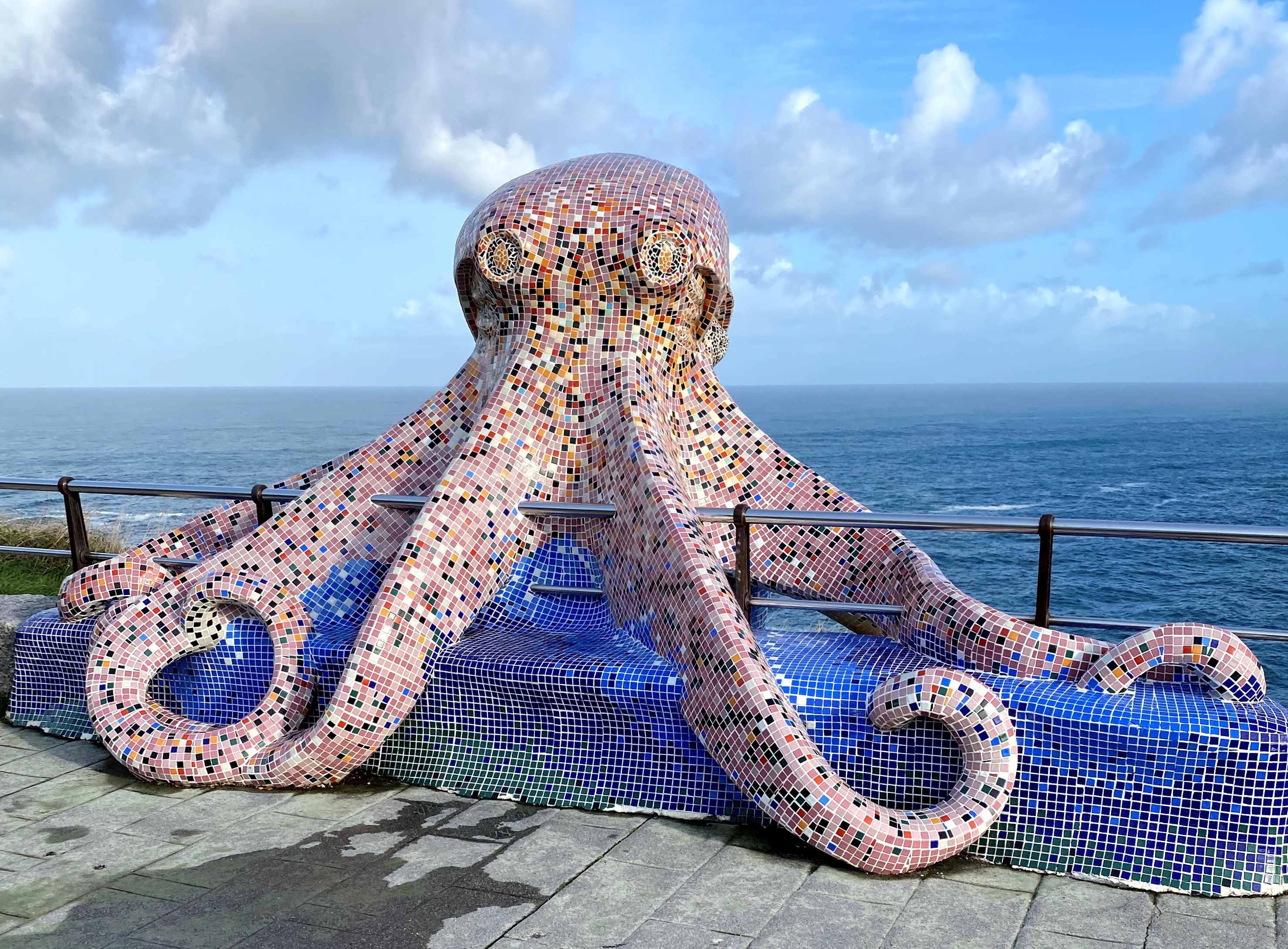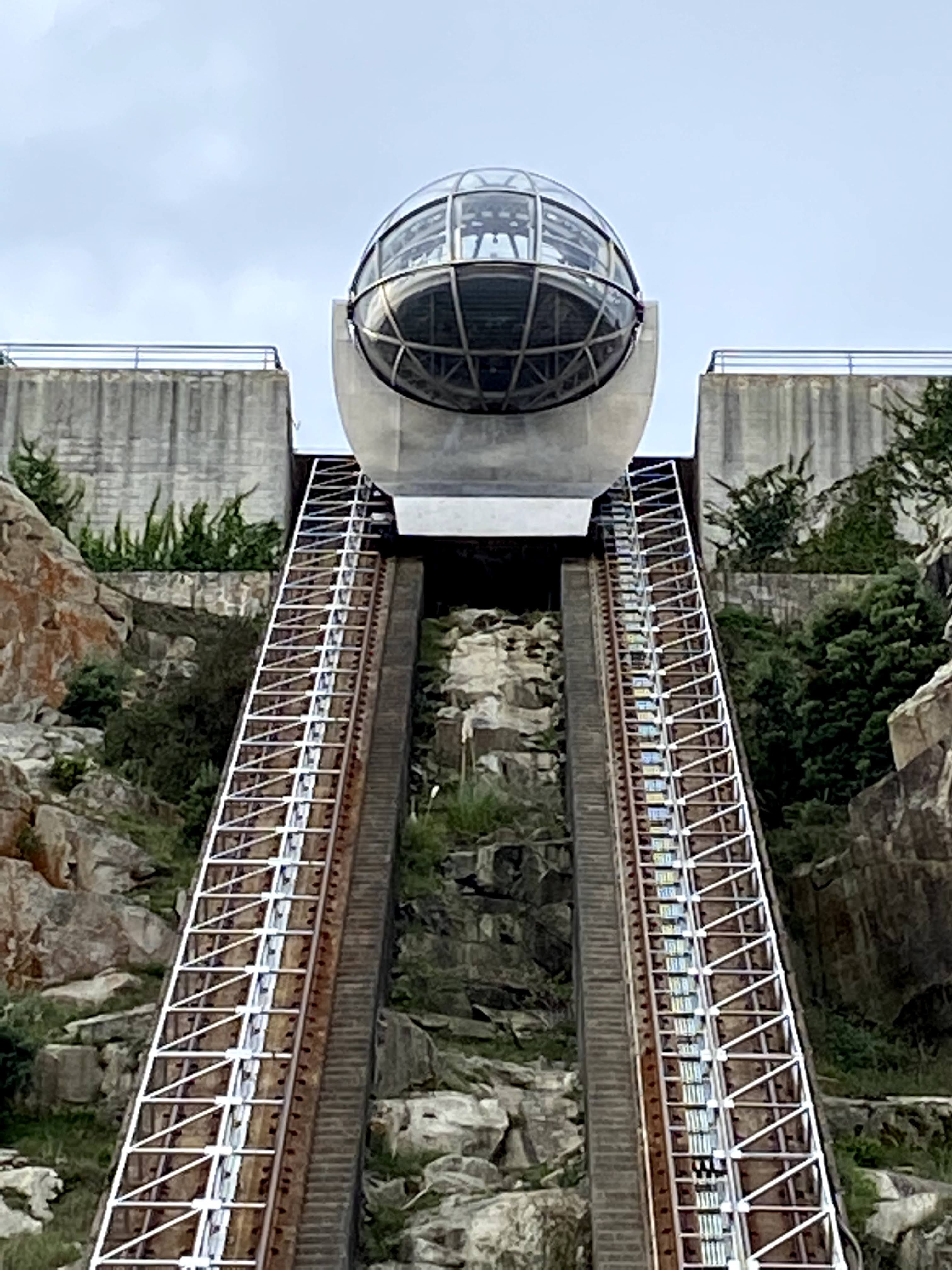 Dejando atrás el Milenium, enfilamos la fuerte subida que nos lleva hacia el Pulpo, punto de parada de muchos turistas para fotografiarse con el mar y la Torre al fondo. Y un poco más adelante, la Bola de cristal que nos lleva a lo alto del Monte de San Pedro.