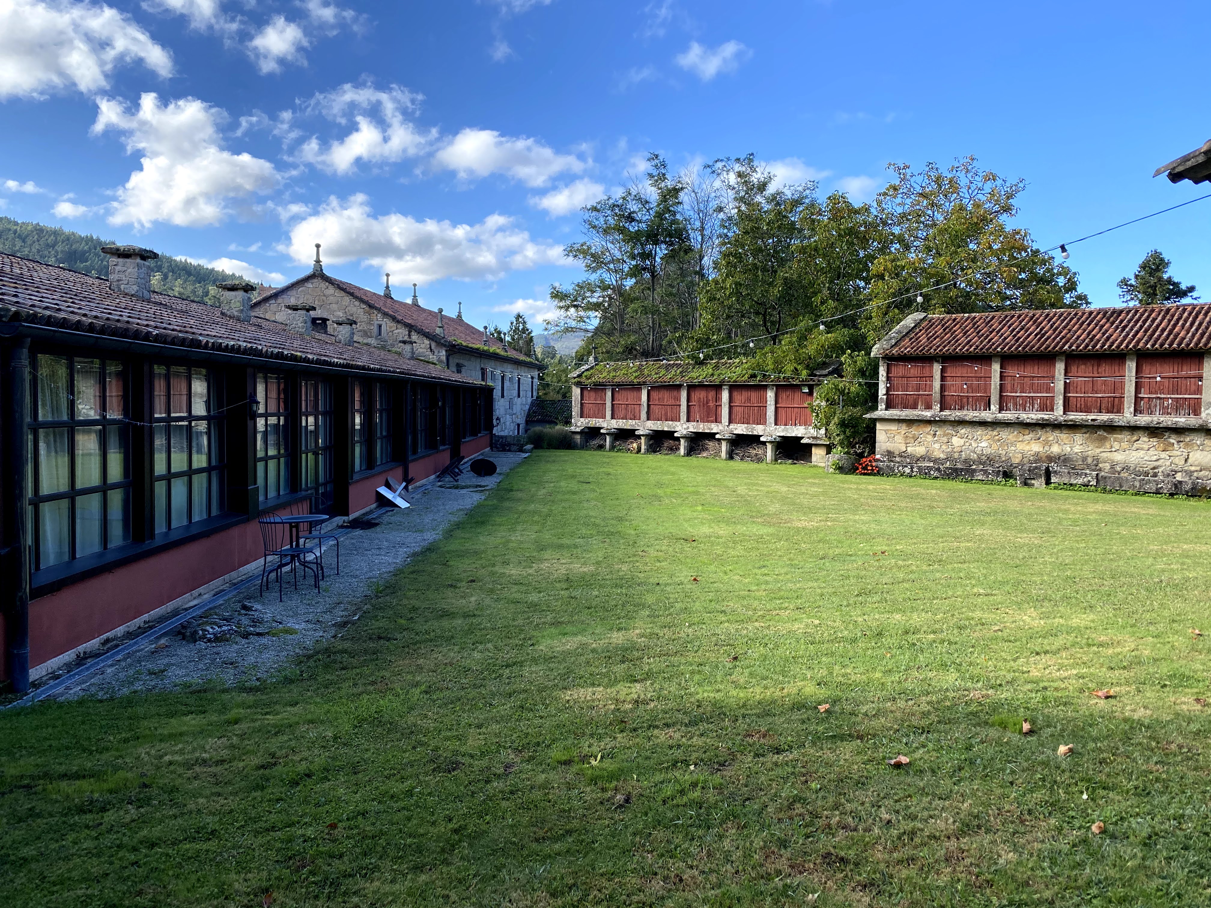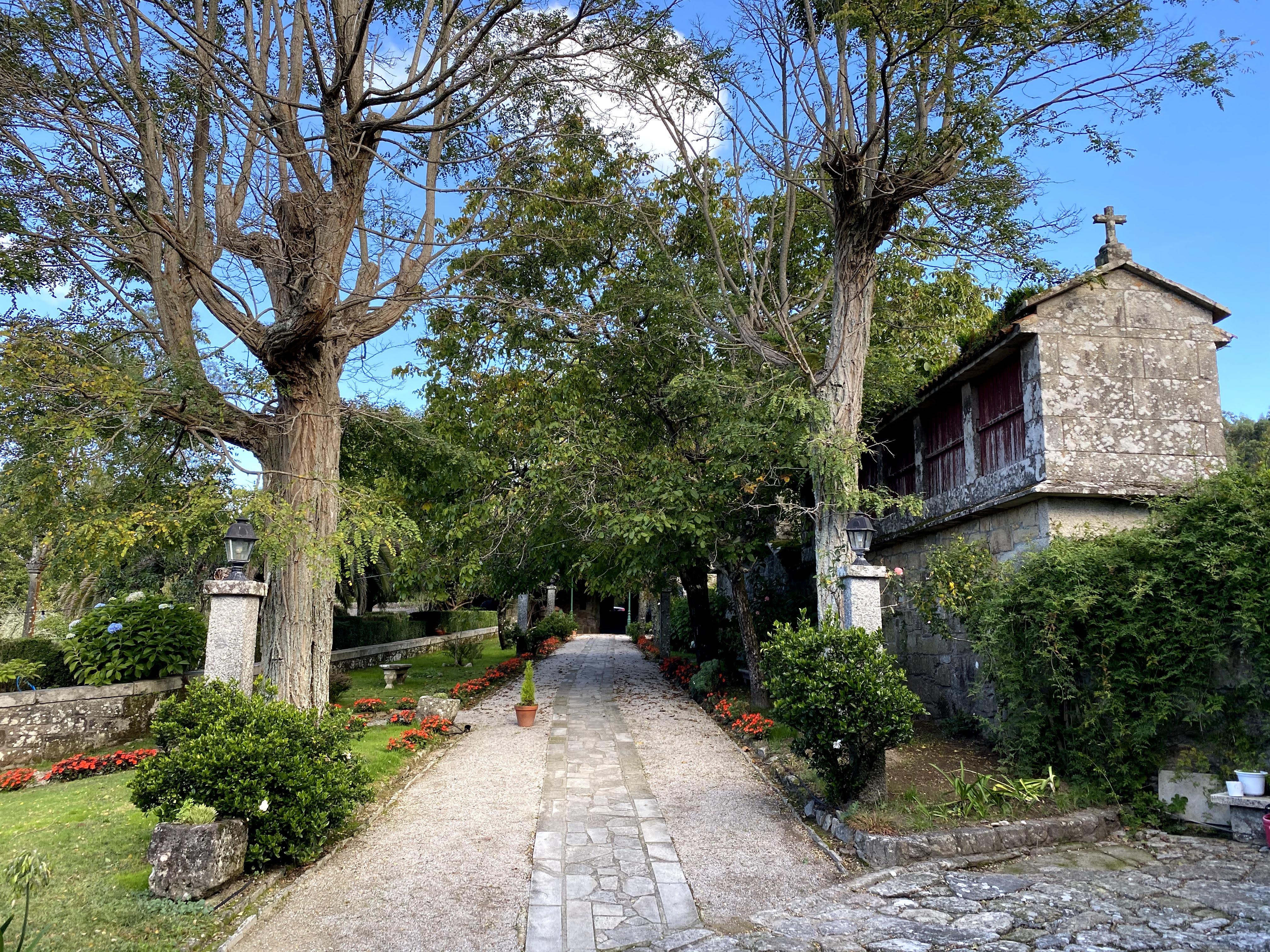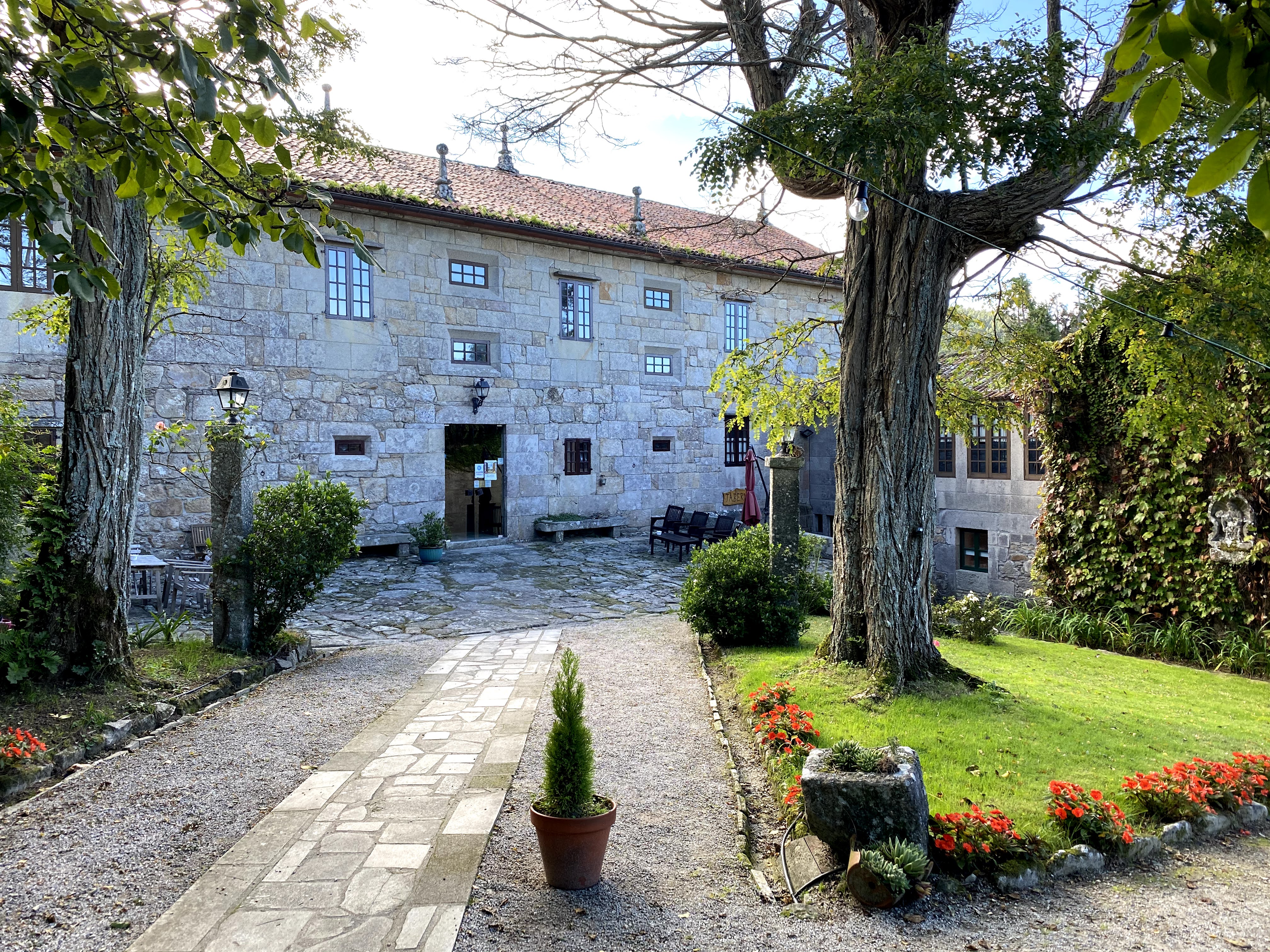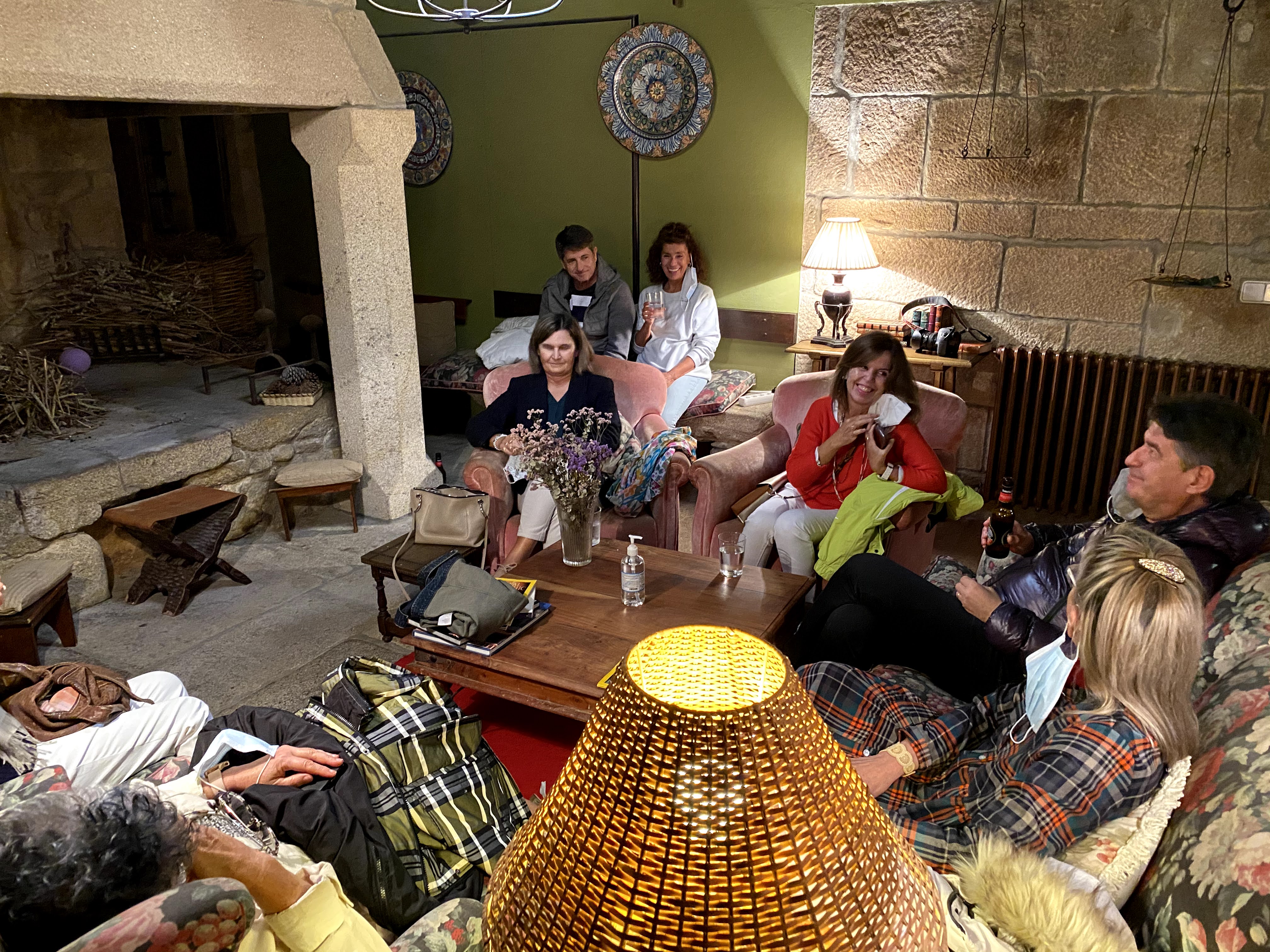 El Pazo La Buzaca es una preciosidad. Ubicado en el municipio de Moraña tiene unos jardines y unas instalaciones perfectas para disfrutar de una estancia relajada en plena naturaleza. Nos alojamos en la zona de las antiguas caballerizas, y tras un recorrido por los exteriores nos juntamos (con mascarilla, por supuesto) en un salón perfecto para nuestro grupo, en el que había incluso una hermosa lareira en la que podríamos haber asado castañas de no ser porque ya se acercaba la hora de la cena, que tras una comida abundante también iba a ser copiosa.