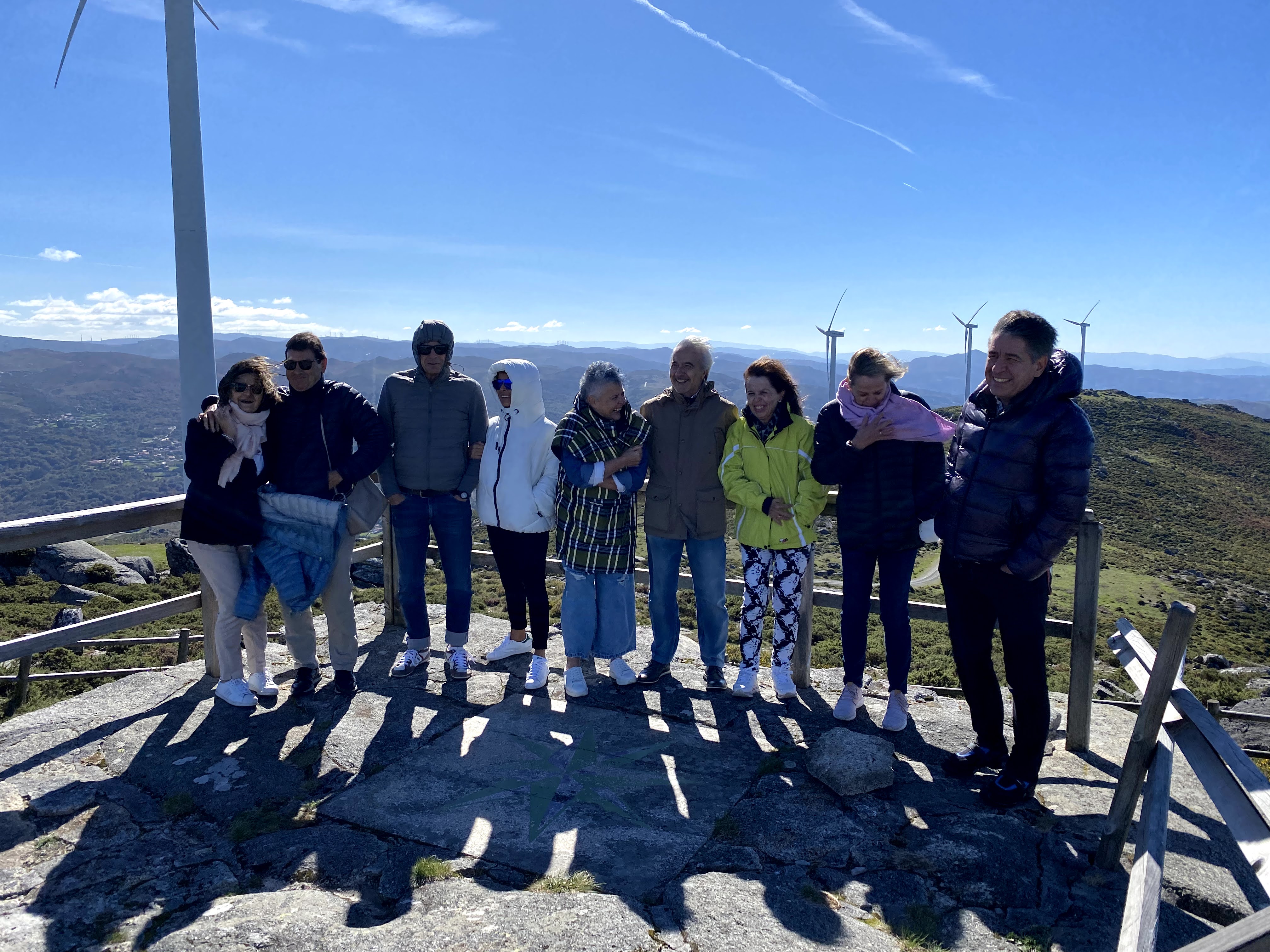 Nuevamente en los coches abandonamos el Pazo, no sin ganas de retornar en otra ocasión ya sea en primavera o verano, y desde allí nos dirigimos a la Serra do Cando, para subir al Miradoiro das Tres Rias, que está en lo alto del monte, donde soplaba un viento increible que justifica la existencia de un gran parque eólico, y desde cuyo mirador se pueden observar las rias de Vigo (con el puente de Rande), de Pontevedra, y de Arosa. Aunque se ven muy a lo lejos, se definen claramente. Allí aprovechamos también para constatar gráficamente la visita, que nos costó bastante debido a que la carretera de acceso es muy estrecha y que en los últimos 5 kms se convierte en poco mas que un sendero de tierra y grava, en el que los coches en ocasiones rozaban los bajos. Pero como todos los asistentes son buenos conductores llegamos a la cima sin más problemas que la lentitud de la marcha en algunos momentos. Tras el mirador, a poco más de un kilómetro está otro punto a señalar, la Porta do Alén (puerta del más allá), a donde nos acercamos para realizar el paso hacia el futuro, hacia otro mundo, aunque todos terminamos regresando al nuestro donde pese a todo nos va bien.