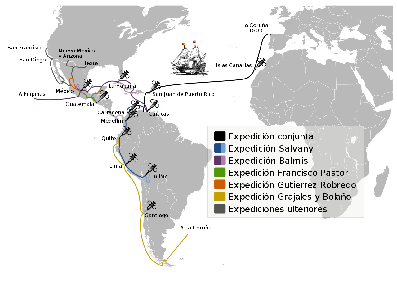 En ese sentido el médico español Francisco Javier Balmis ideó la forma de hacer llegar a los territorios españoles de ultramar la solución para curar la viruela. El sistema empleado consistió en trasladar a un grupo de niños (22) seleccionados entre la Casa de los Desamparados de Madrid (4), el Hospital de la Caridad de A Coruña (13) y otros 5 de Santiago. A uno de esos niños, que no habían pasado la viruela, se les inoculaba una pequeña dosis del virus de la enfermedad para que generase anticuerpos y cada nueve o diez días se repetía el proceso con otro, de forma que con todos ellos se cubría el trayecto de navegación hasta llegar al puerto de destino, donde ya podía comenzar a aplicarse el tratamiento a la población que lo necesitaba.