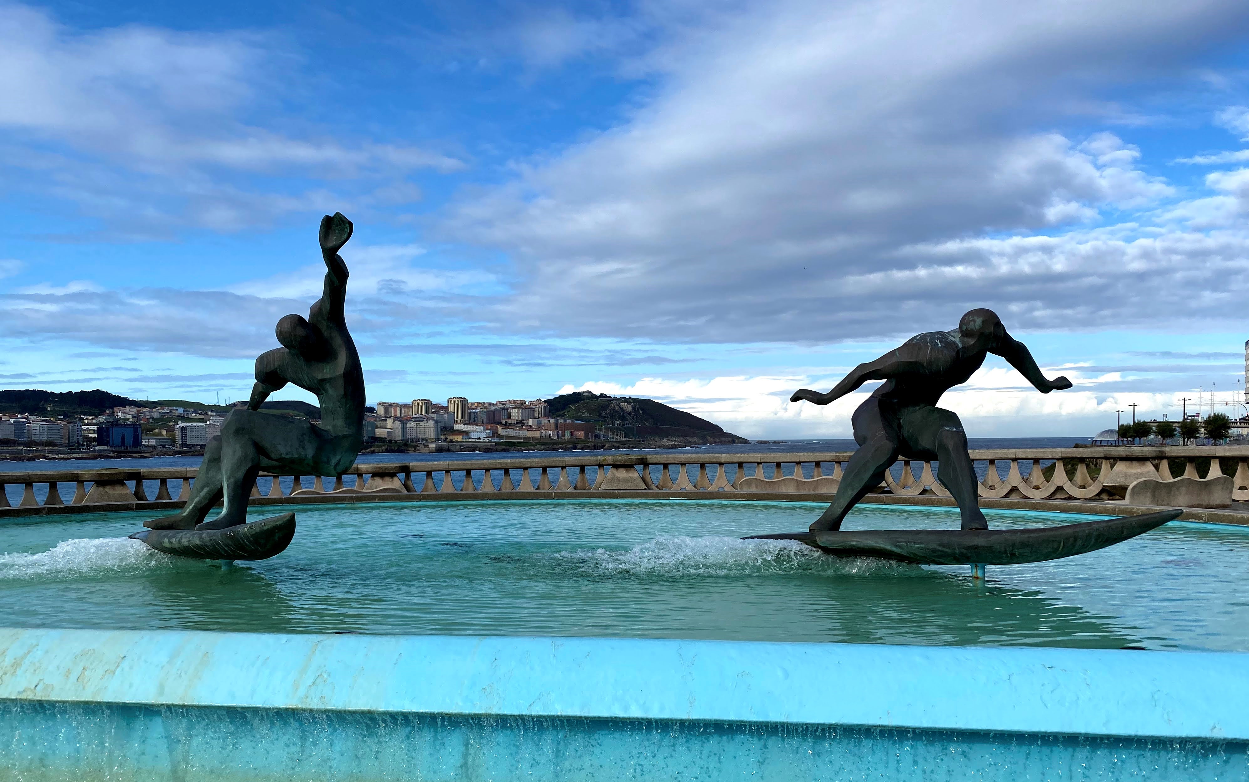 Y si, en un nuevo y diferente paseo, partiendo del mismo lugar (parte trasera del IES Eusebio da Guarda), nos dirigimos a la derecha, en dirección a la Torre, el recorrido (siempre bordeando el mar) después de sobrepasar el monumento a los policias ya descrito y fotografiado, nos lleva en primer lugar a pasar junto a la fuente de los surfistas, frente al hotel Maria Pita, y sobre la playa del matadero donde los aprendices de surfista hacen sus pinitos.