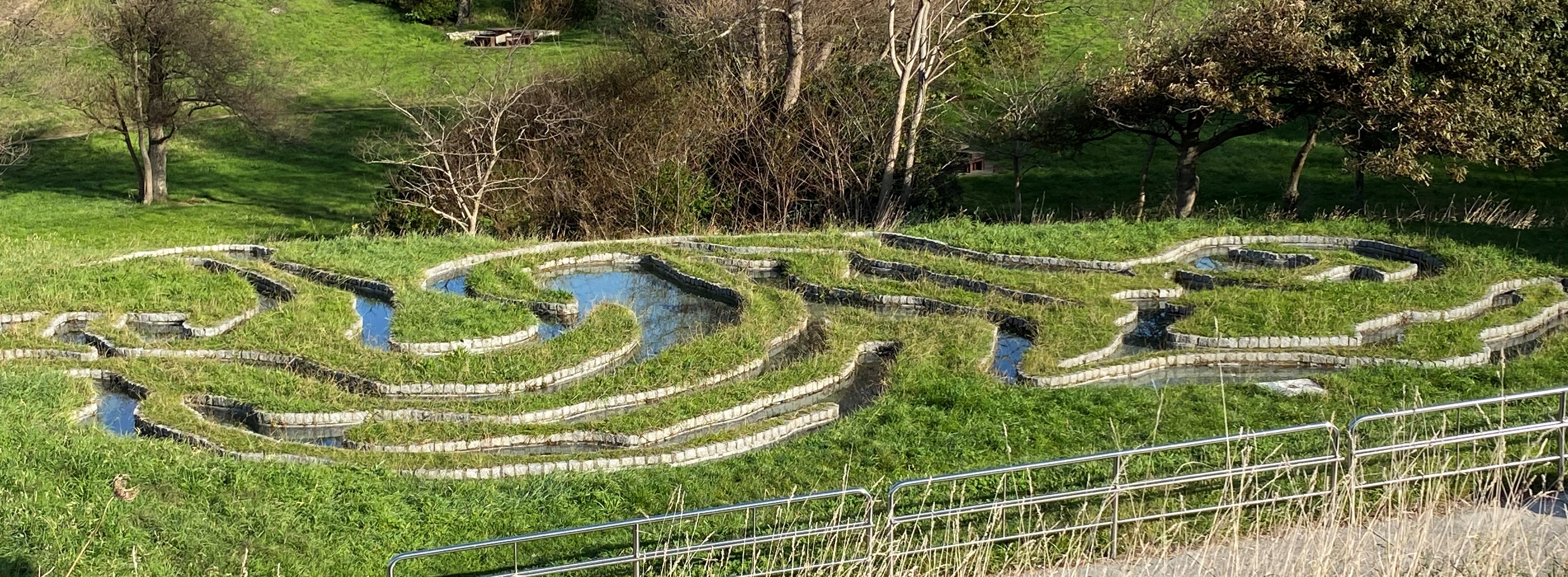 Por último, y como cierre, un elemento externo lateral del paseo marítimo que inicialmente yo he considerado como un laberinto, pero que realmente forma parte del parque escultórico y que se denomina El Combate, ya que trata de hacer referencia al combate que mantuvieron Hercules y Gerión. Está basado en un cuadro abstracto de igual titulo cuyo autor es Tim Behrens. Es en realidad un estanque.