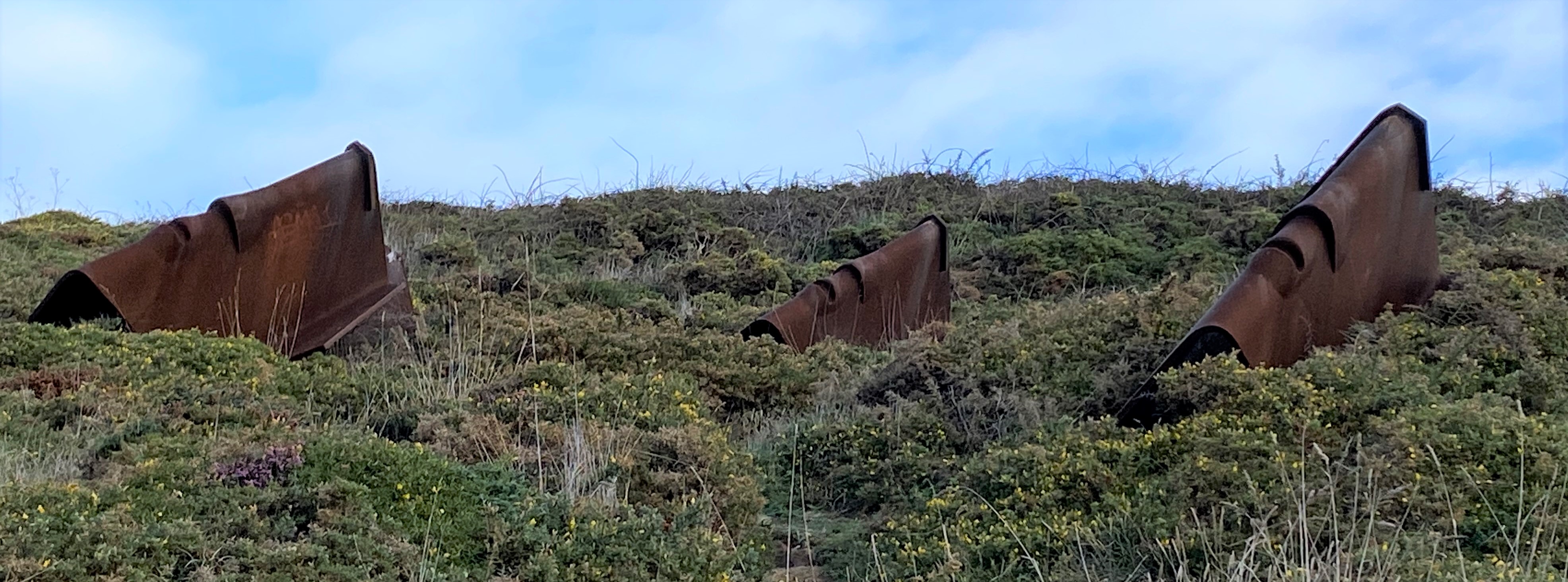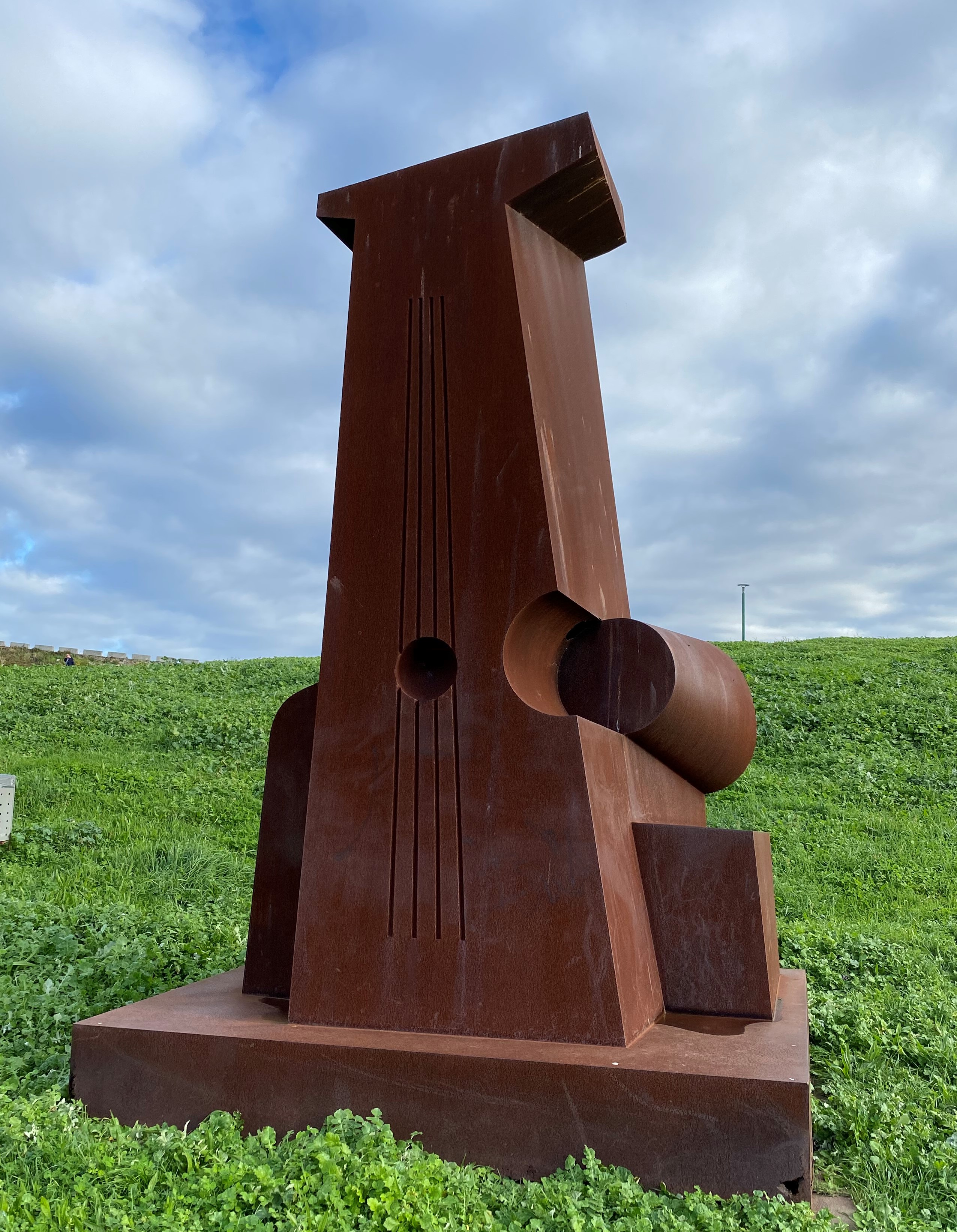 Un poco más adelante, la representación del Menhir Pentacefálico, una escultura con cinco caras que representa a los pueblos provenientes de los cinco continentes a través de mar. Y a continuación, siguiendo con la subida, tres esculturas representativas de las tres cabezas del gigante Gerión vencido. Realizadas con planchas de acero.
