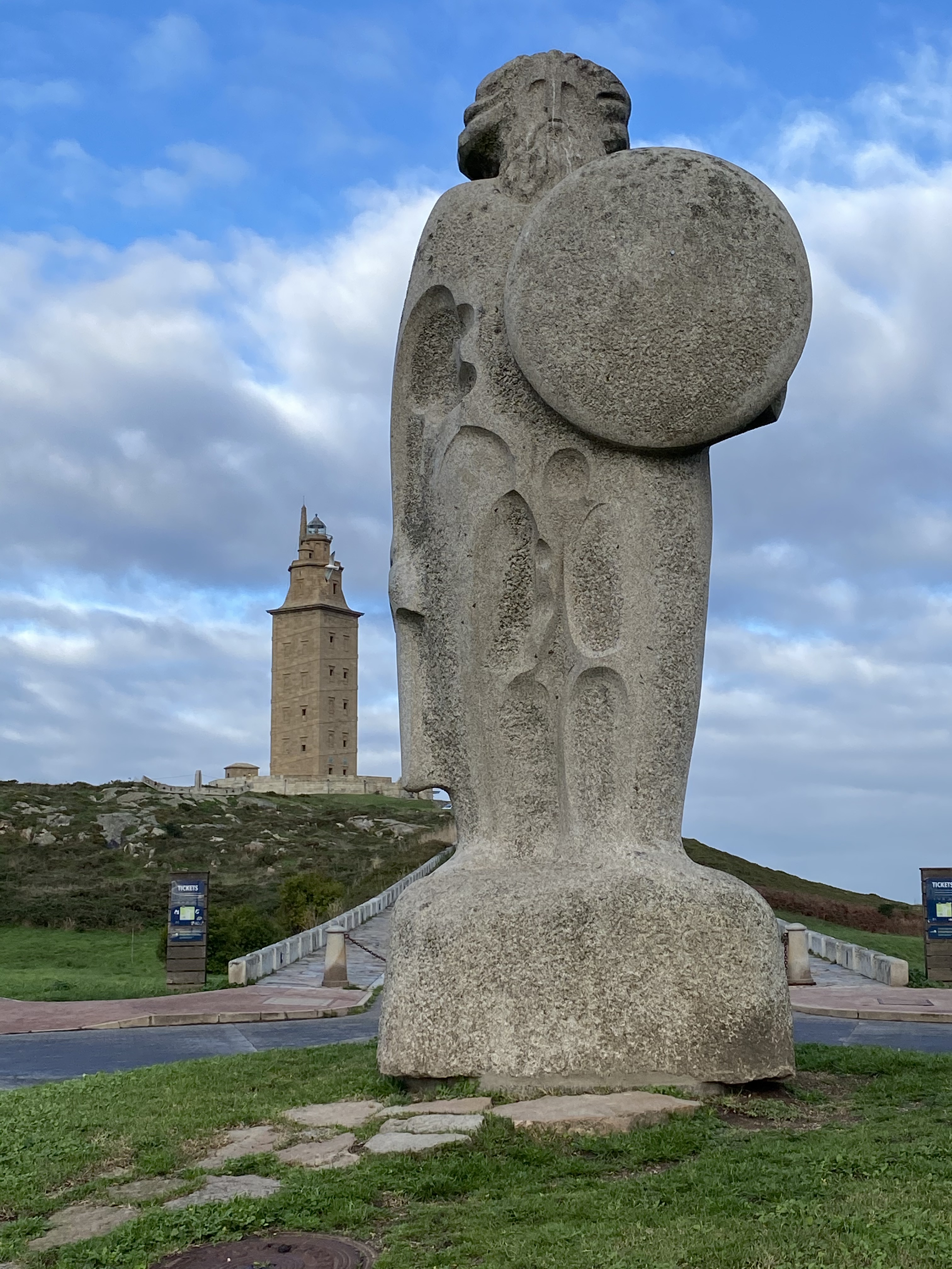 Al llegar a la rotonda desde la que se iniciaría la subida al monumento, nos encontramos una gran estatua de Breogán, obra de Xosé Cid. En ella aparece el heroe mitológico gallego con su espada y escudo.