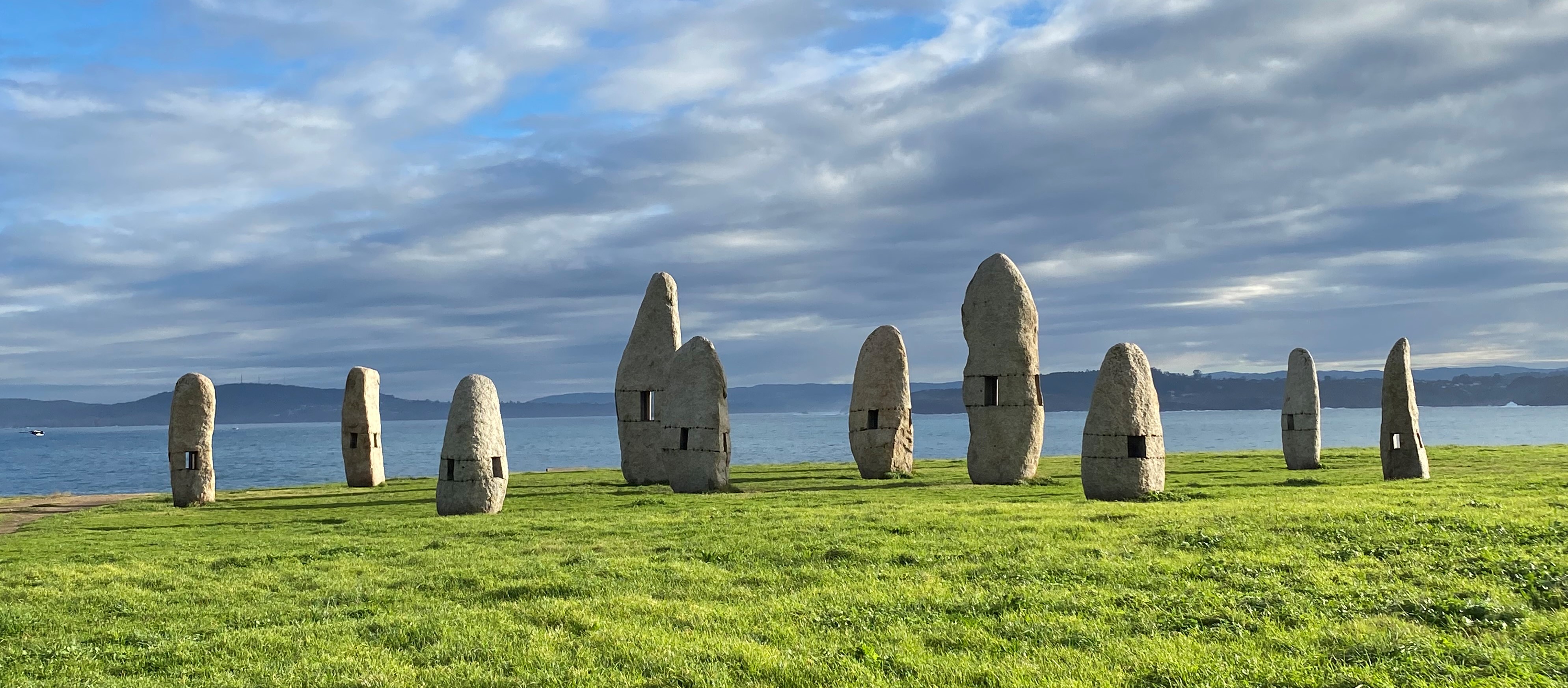 A partir de esa rotonda, tomamos la dirección hacia la derecha, donde se encuentran las otras esculturas. Desde allí se divisa una buena imagen de los tres cubos situados en la península de Punta Herminia, en el denominado Monte dos Bicos, que agrupa una serie de petroglifos de la Edad del Hierro con formas geométricas, signos y cruces tallados en la roca. En el saliente de Punta Herminia está también la Caracola, que se ha convertido en un elemento muy representativo de la zona.