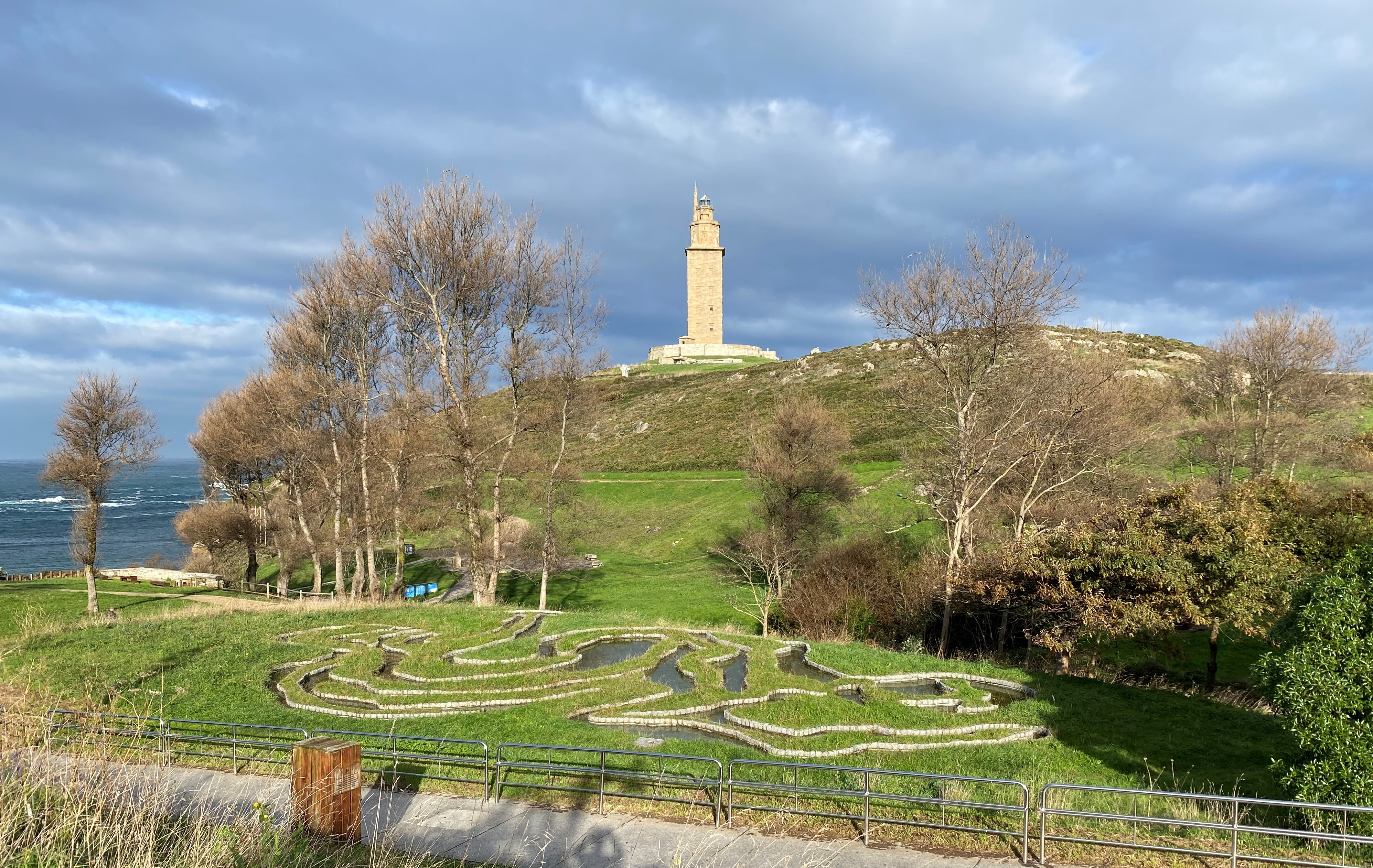 Poco más adelante nos encontramos, a la izquierda, con un laberinto de pequeños lagos semioculto entre la vegetación, y a la derecha con el edificio de la antigua Prisión Provincial, hoy muy deteriorado y que evito de forma consciente poner aqui. Simultáneamente tiene el paseante, mirando a la izquierda, una impresionante vista de la Torre de Hércules, con la playa de As Lapas debajo.