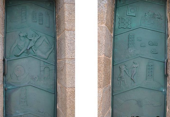 Rodeando la Torre, al llegar a la entrada principal nos topamos con la escultura de un soldado de la época. Y en la base del monumento están las puertas, realizadas en bronce y con tallas que se inspiran en los mitos y leyendas que existen sobre el faro. Se representa tanto la lucha de Hércules con el gigante Gerión, como referencias a las obras de reconstrucción y reforma de la Torre.
